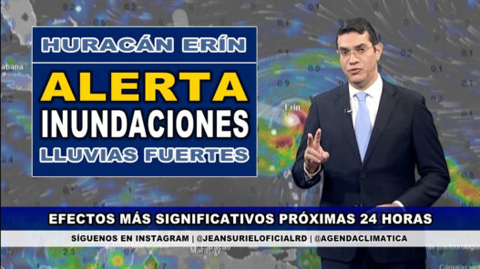 Algunos fragmentos nubosos asociados a la amplia circulación del Huracán Erín han llegado a República Dominicana: en las próximas horas serán mayores los efectos, con un aumento de las precipitaciones y elevando el potencial de inundaciones repentinas. ATENTOS: Oleaje peligroso desde esta noche en la costa atlántica.