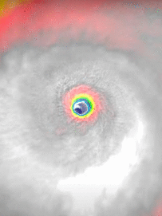 Los vientos con fuerza de huracán se extienden hasta 30 millas (45 km) del centro, mientras que los vientos con fuerza de tormenta tropical alcanzan hasta 125 millas (205 km), principalmente al norte del sistema.